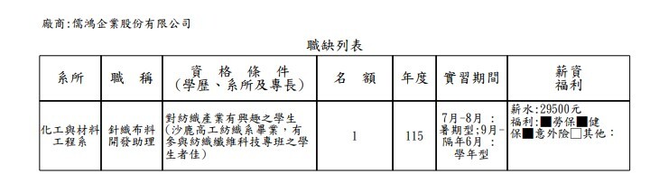 【實習徵才】114-2學年型儒鴻企業股份有限公司(履歷投遞截止:115.05.15)